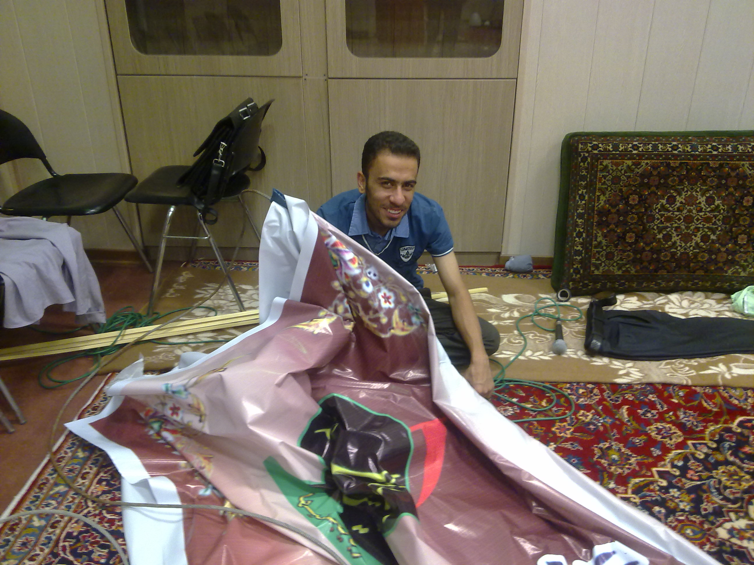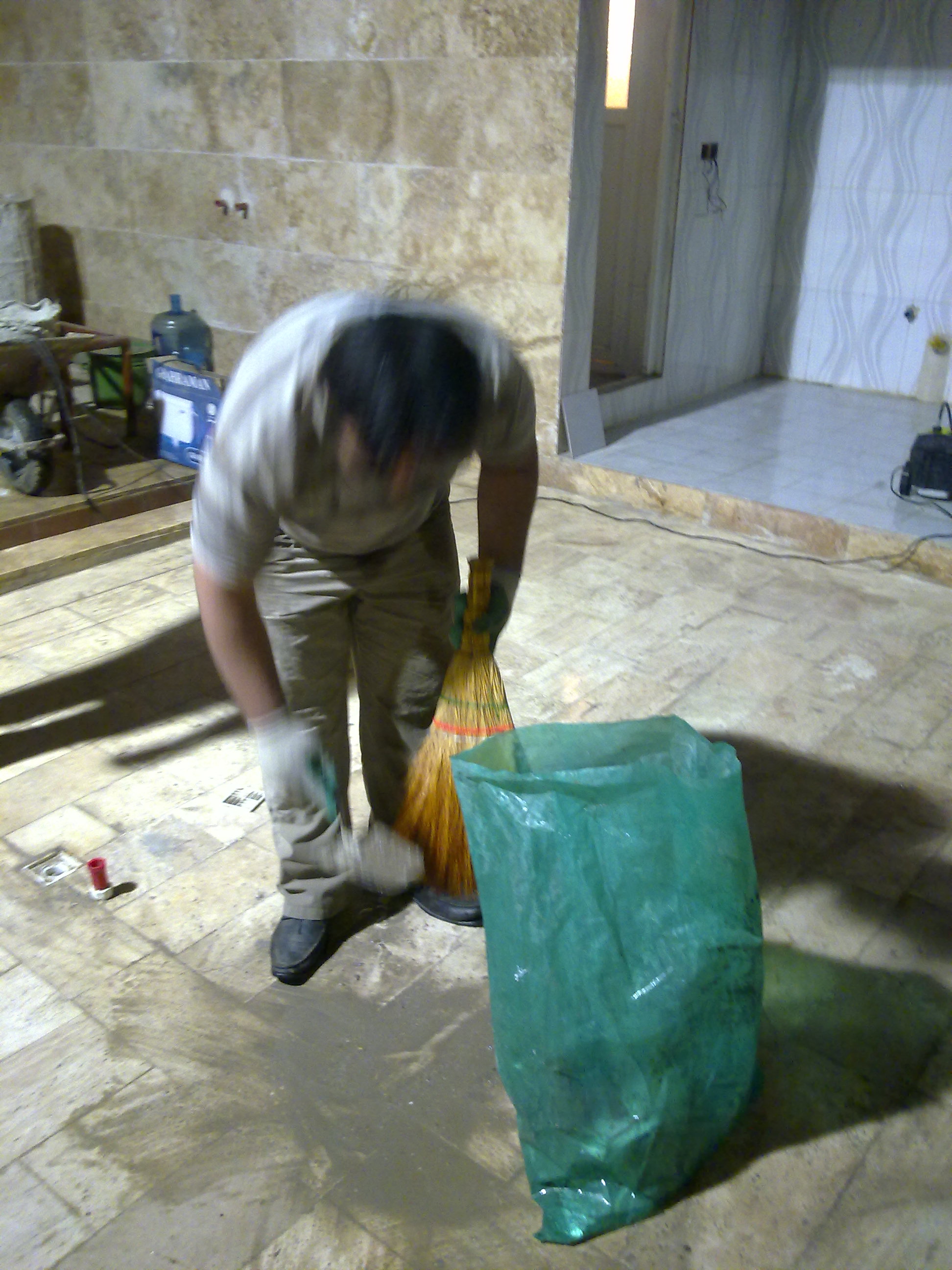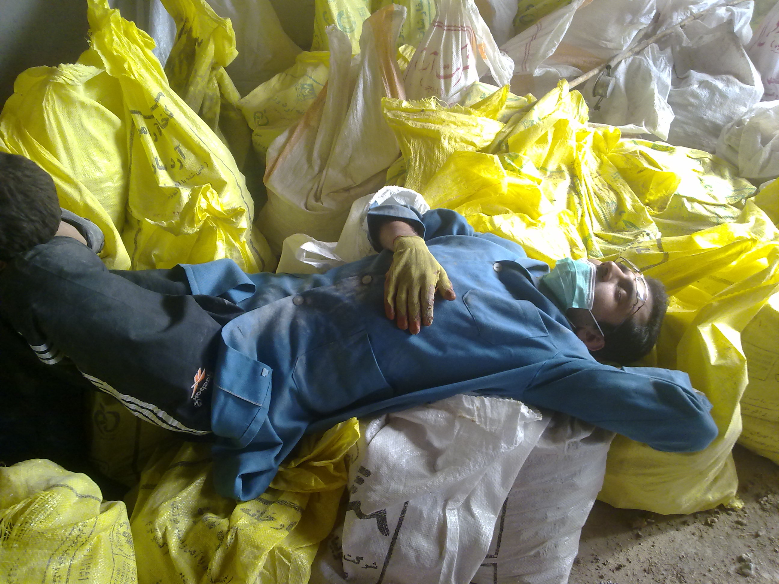 همانطور که ملاحظه میفرمایید یکی از جوانان خدوم هیئت بعد از حمل بسیاری از نخاله های جمع شده در محل حسینیه از فرط خستگی بر روی همین کیسه ها به خواب آرام و عمیقی فرو رفته است
